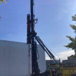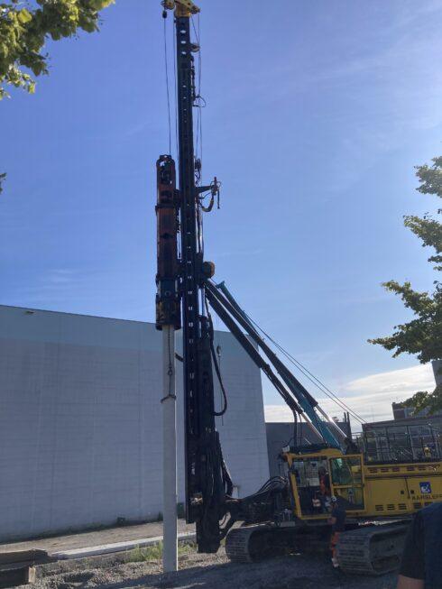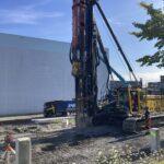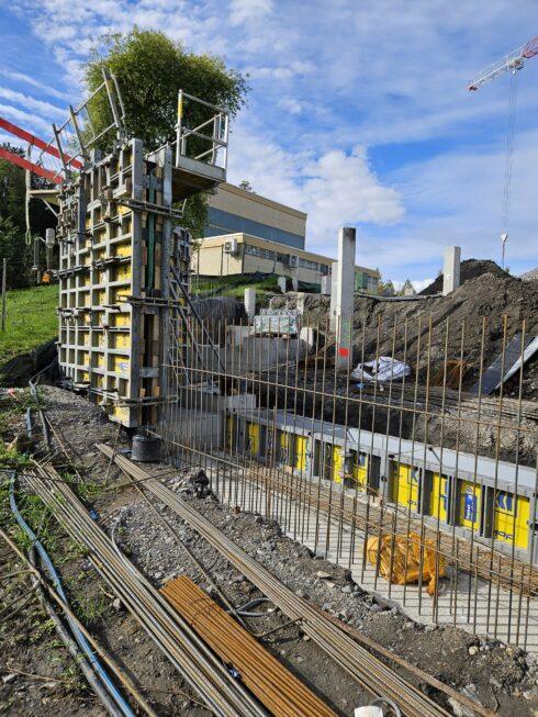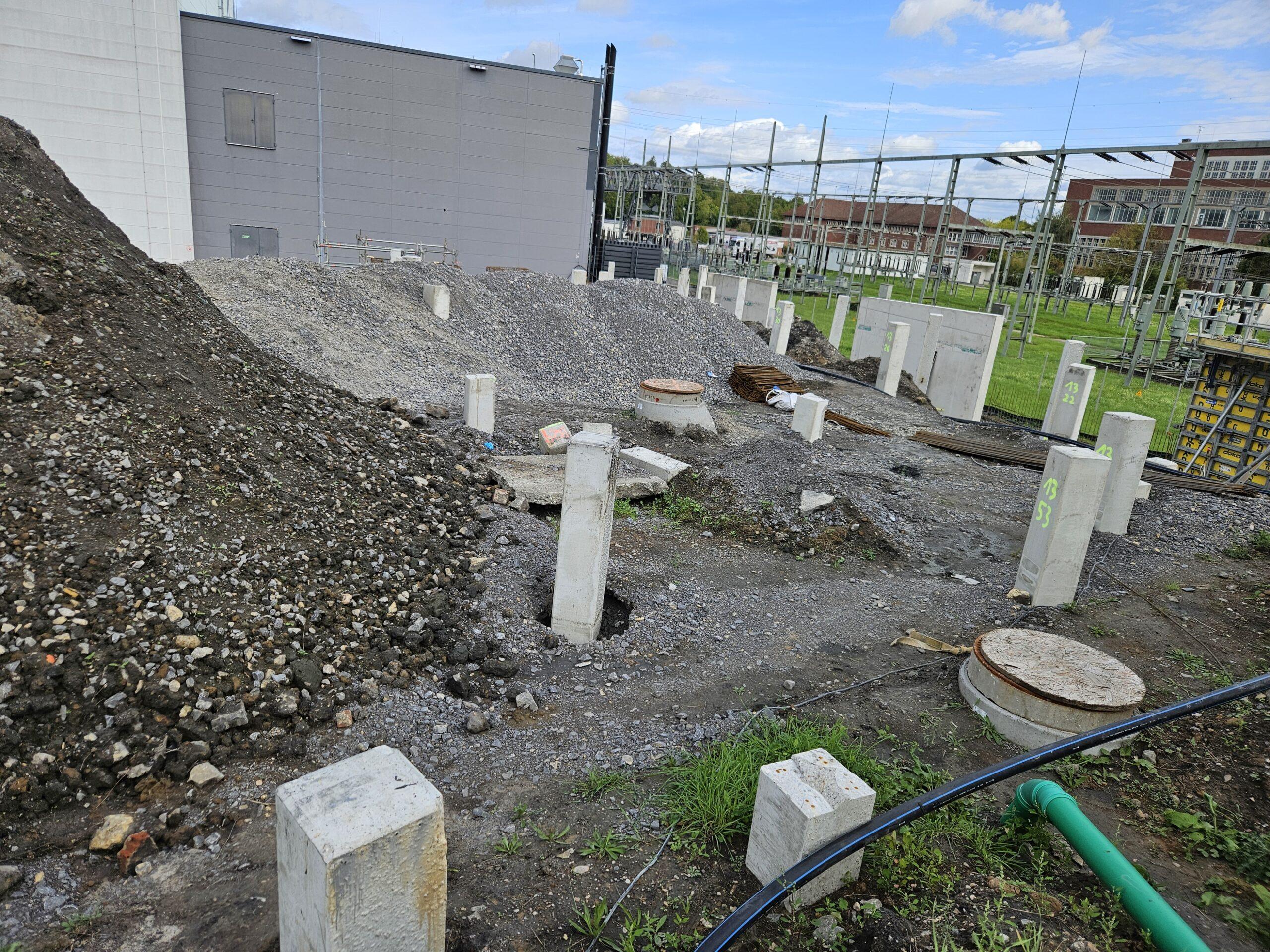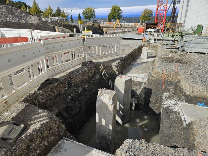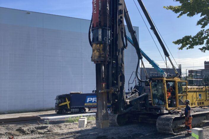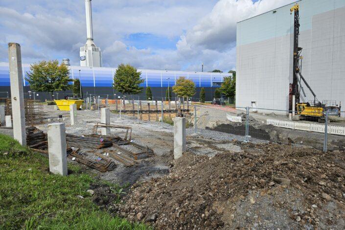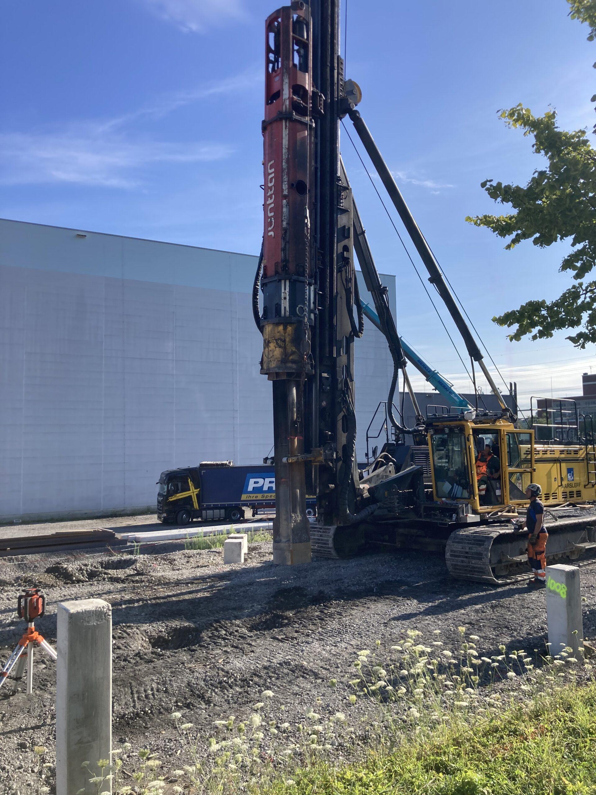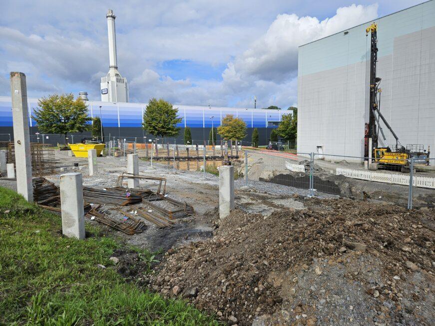Die Arbeiten an der Rammpfahlgründung liefen auf Hochtouren und sind inzwischen abgeschlossen. Mit schwerem Gerät werden vorgefertigte Betonpfähle in den Boden gerammt, um die stabile Basis für die neue Industrieanlage zu schaffen. Parallel dazu wurden bereits die ersten Schalungen für die Stützwand der Außenanlagen aufgestellt – der nächste Bauabschnitt kann beginnen.