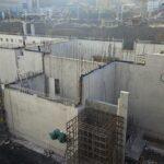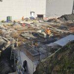 Nach Abschluss der Bewehrungsarbeiten steht nun die Betonage der Bodenplatte der Sprinkler-Tank an. Parallel dazu werden die Schalungen für die Fundamente abschnittsweise gestellt, dabei werden die Pfahlköpfe auf die erforderliche Höhe gekappt. Auf der bereits fertiggestellten Bodenplatte der Sprinkler-Zentrale haben außerdem die Arbeiten an den ersten Wänden begonnen. So wächst die neue Industrieanlage Stück für Stück weiter.