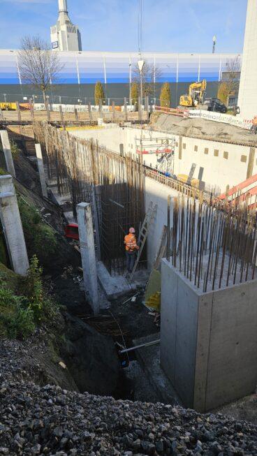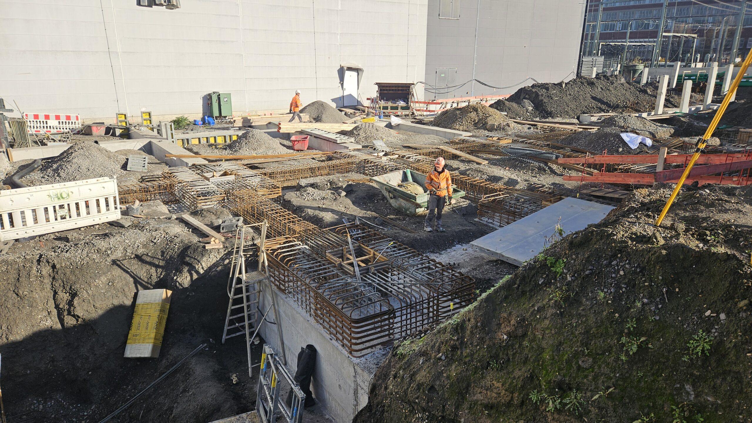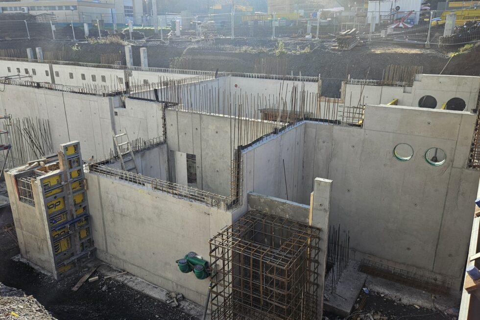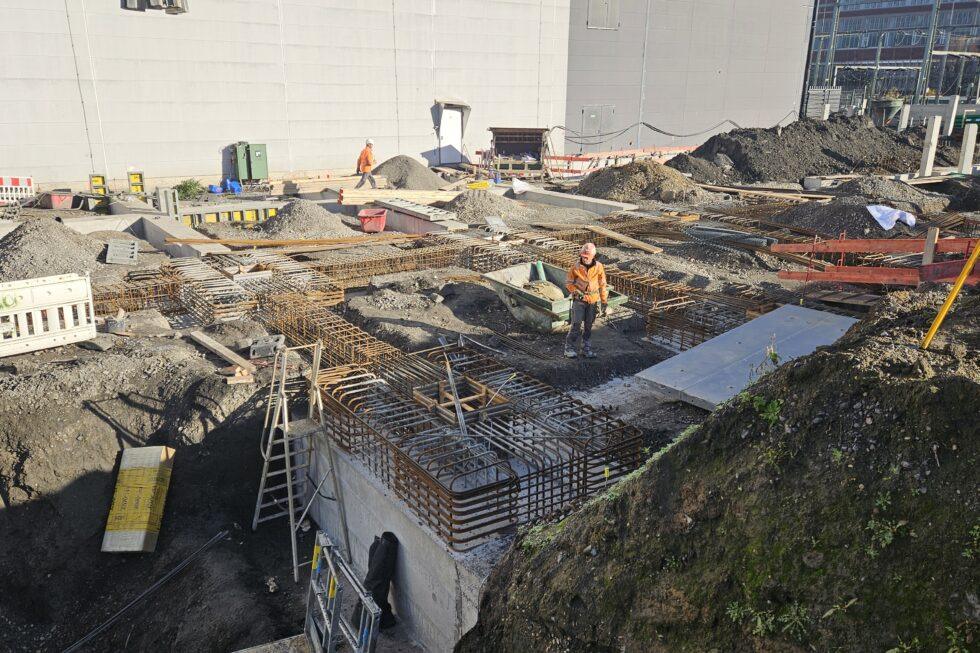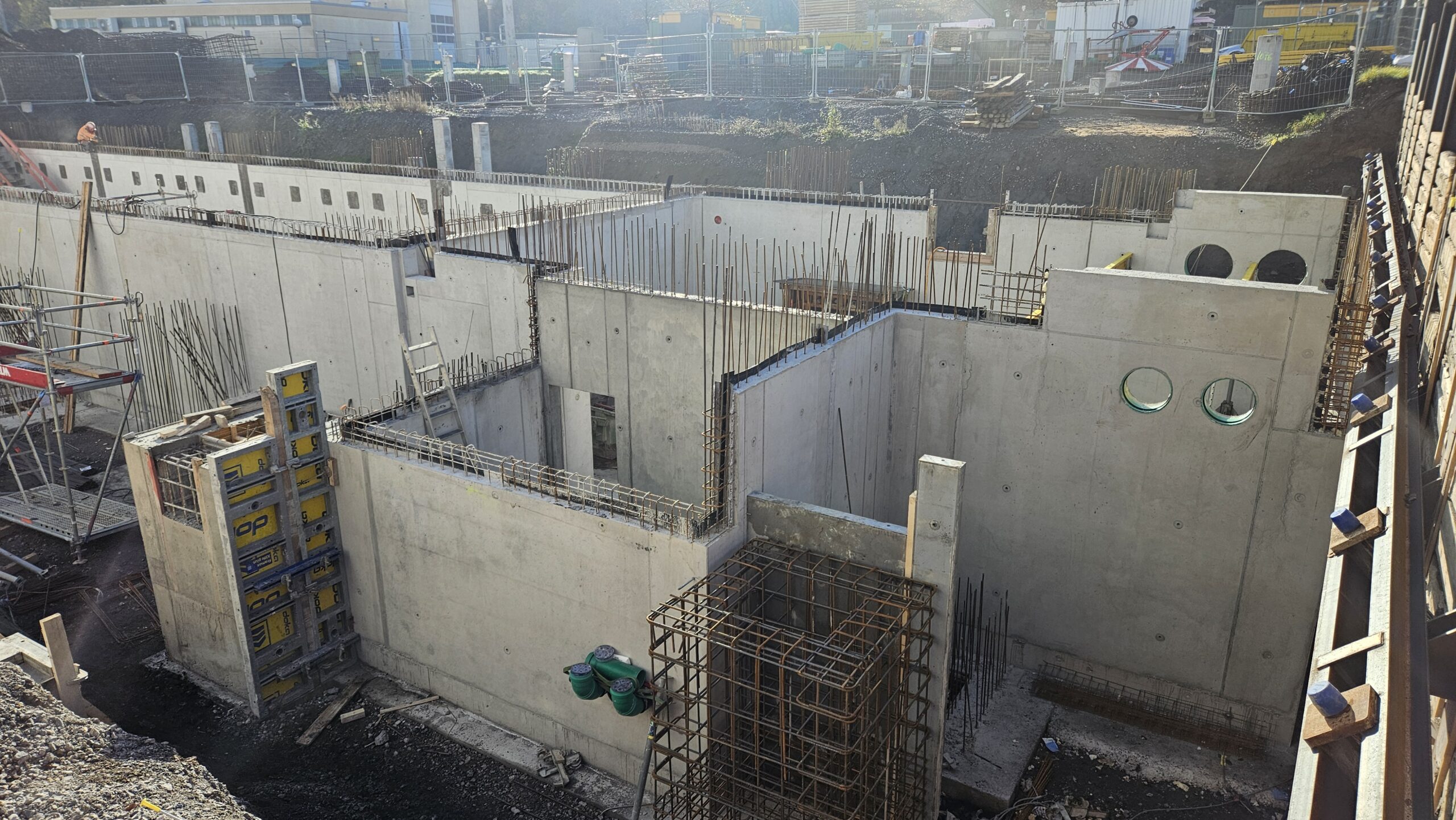 Die Wände der Ebene E-1 sind betoniert, darunter die Bereiche Sprinklertank, Sprinklerzentrale, Treppenhaus und Installationsschacht. In der darüberliegenden Ebene E0 schreiten die Fundamentarbeiten weiter voran. Rund um den Sprinklertank entstehen zudem die Stützenfundamente, welche später die tragenden Elemente der neuen Industrieanlage aufnehmen werden. Schritt für Schritt wächst das Bauwerk in die Höhe.